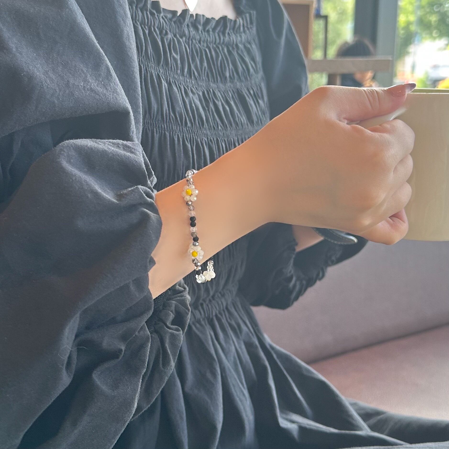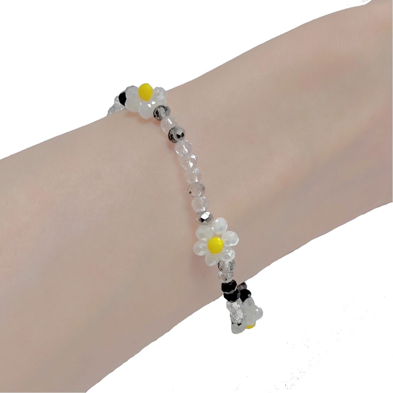 フラワーモチーフのビーズブレスレット。 ユニセックスで着用いただけます。 ほかのブレスレットと重ね付けをしても華やかでおすすめです。 ビーズの個体差により若干のサイズ差、デザインの違いがございます。 強く引っ張ると破損の可能性がございますので着脱の際はお気をつけください。 サイズ F